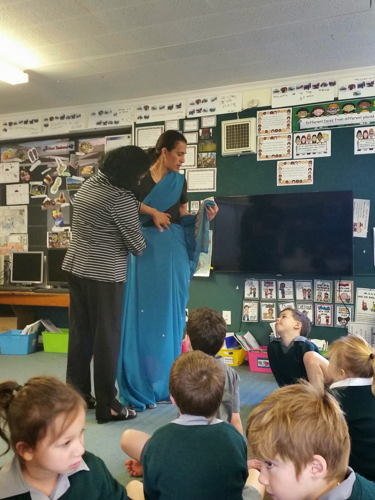 On Friday, Miss Veena's mum visited Great 8 and showed us how to wear a sari. Mrs Te Amo loved wearing the sari.